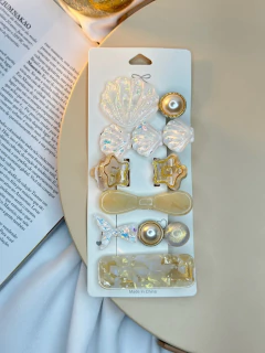- Início / ACESSÓRIOS DE CABELO / Bico de pato / Cartelona 7 peças rabo de sereia dourado CARPK01